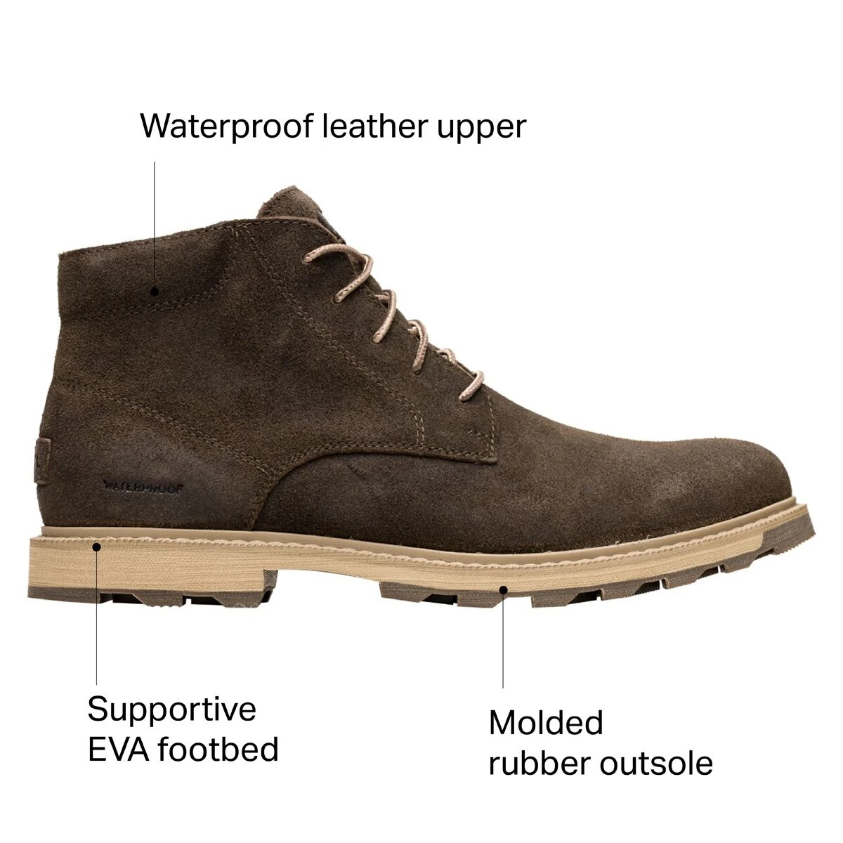From work to play, the Sorel Madson II WP Chukka Boot provides us with boundless versatility and style. The waterproof, full-grain leather is fully sealed to ensure protection throughout inclement weather, while a removable, molded footbed offers arch support for day-long comfort.