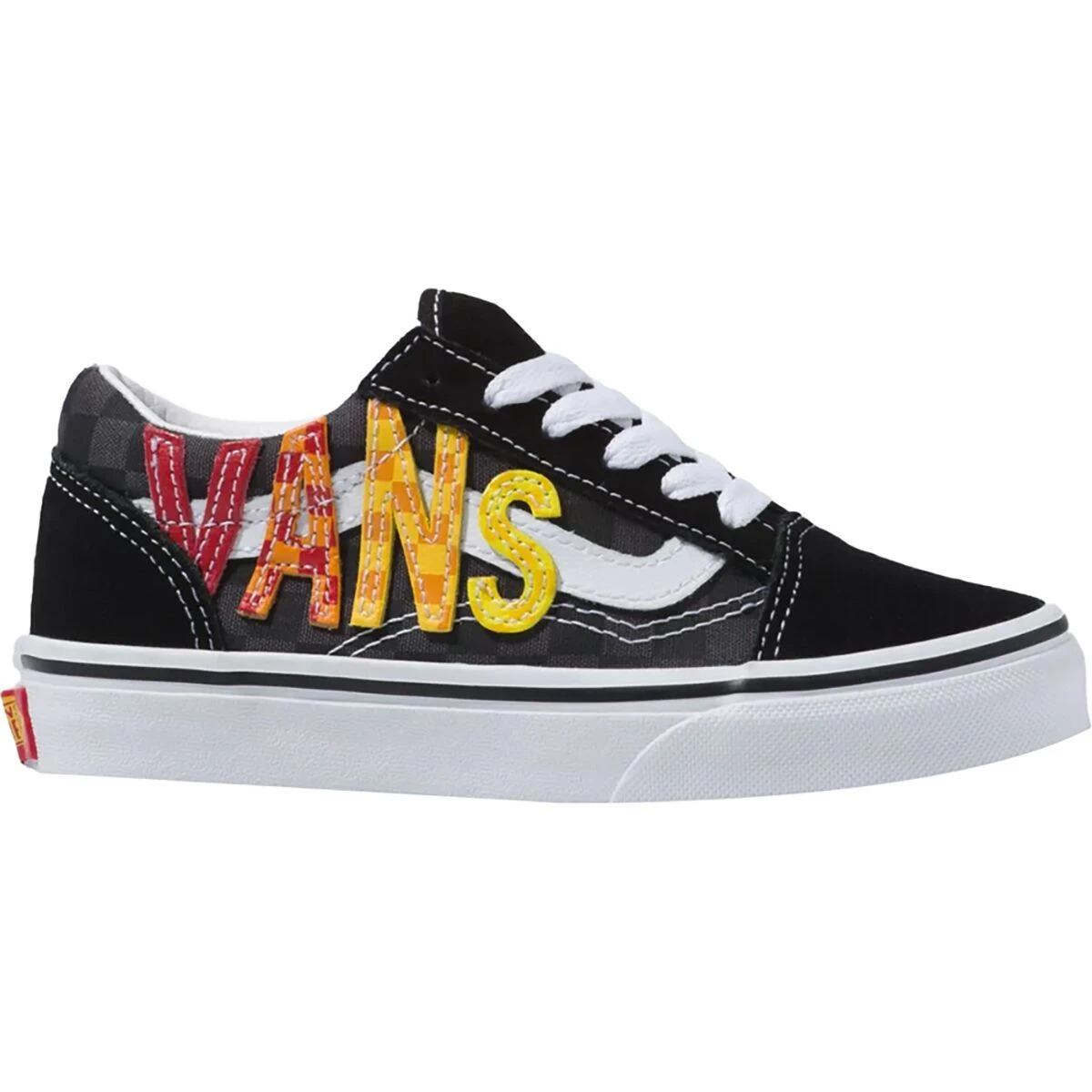 The Old Skool V, inspired by the classic Vans skate shoe, features a low profile silhouette with sturdy canvas and suede uppers, hook-and-loop closures, padded collars for support and flexibility, and signature rubber waffle outsoles.