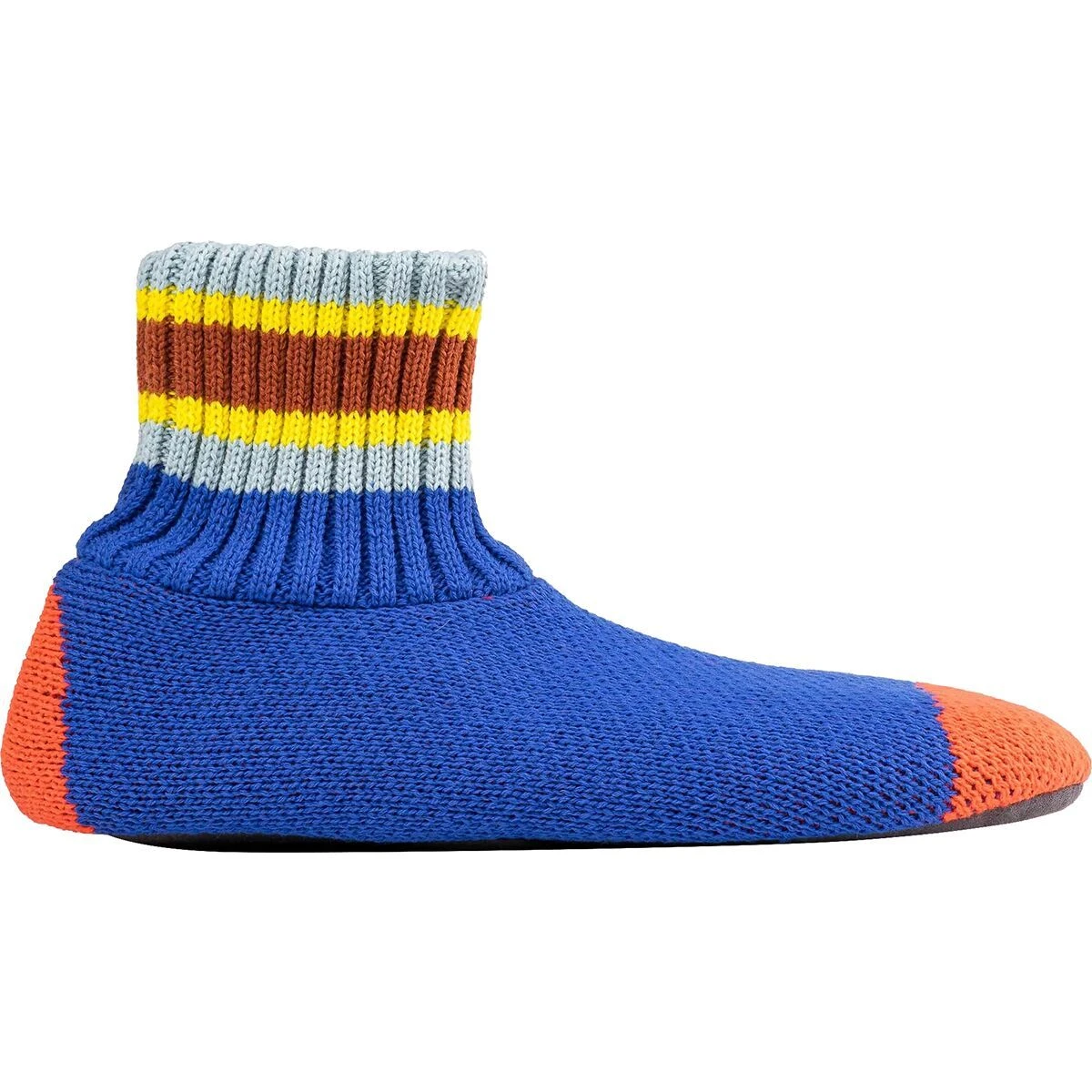 Fleece-lined knit slippers with 2.5″ striped rib cuff and contrast toe and heel.